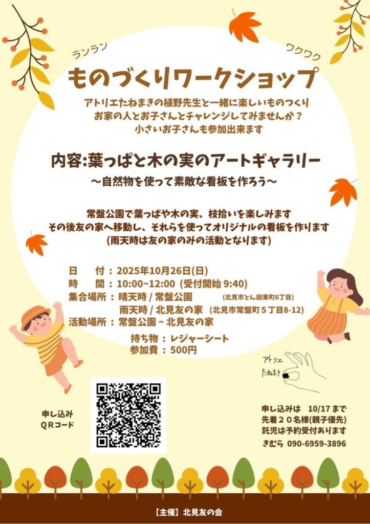 10/26 ものづくりワークショップ開催のお知らせ 2025年9月22日 最終更新日時 : 2025年9月22日 tanakakanae 今年も アトリエたねまきの植野先生と一緒に 楽しいものづくり ワークショップを行います今回は公園で自然を感じながら 葉っぱや木の実 枝拾いを楽しみますその後 友の家に行きオリジナルの看板を作ります参加お待ちしています10月26日(日)午前10時〜12時まで参加料 ひとり 500円申込はQRコードからお願いします Follow me! FacebooktwitterHatenaPocketCopy