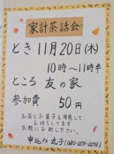 11月20日(木) 10時〜11時30分場所 北見友の家家計のこと お茶を飲みながらゆっくり話しませんか?家計簿をつけたい方、質問、家計の記帳が溜まっている方などどなたでも ご参加お待ちしています。当日 申し込みしていな […]